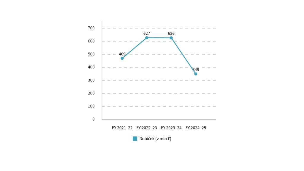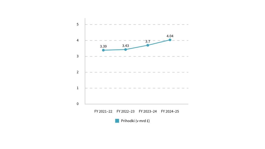 | Poslovno leto | Prihodki (mrd £) | Dobiček pred davki (mio £) |